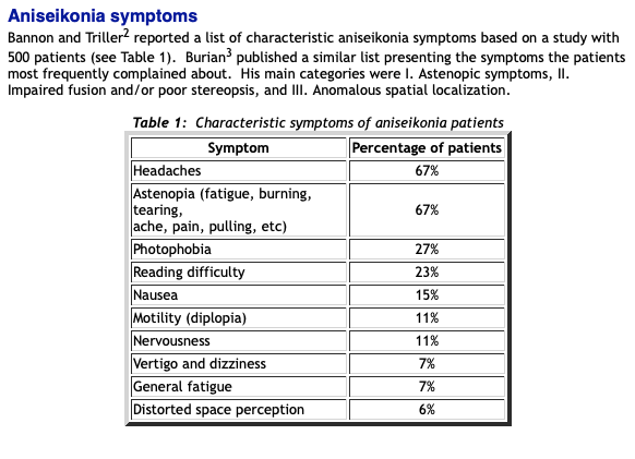 Dynamic aniseikonia or (optically induced) anisophoria means that the eyes have to rotate a different amount to gaze (i.e. look with the sharpest vision) at the same point in space. This is especially difficult for eye rotations in the vertical direction. .